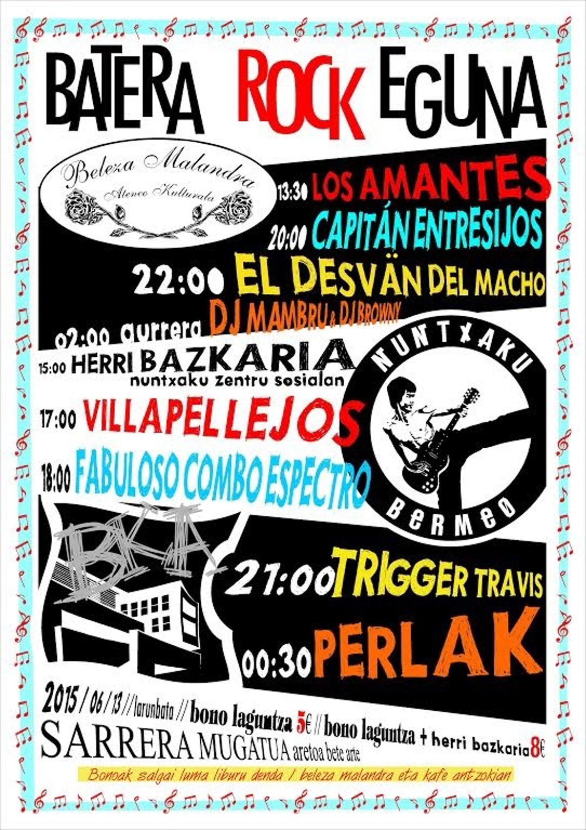 La asociación cultural Nuntxaku, el ateneo cultural Beleza Malandra y el Kafe Antzokia de Bermeo (Bizkaia) han organizado la primera edición del Batera Rock Eguna para este sábado, 13 de junio, con la actuación de las bandas Trigger Travis, El Desvän del Macho, Perlak, Villapellejos, Capitán Entresijos, Los Amantes y Fabuloso Combo Espectro.