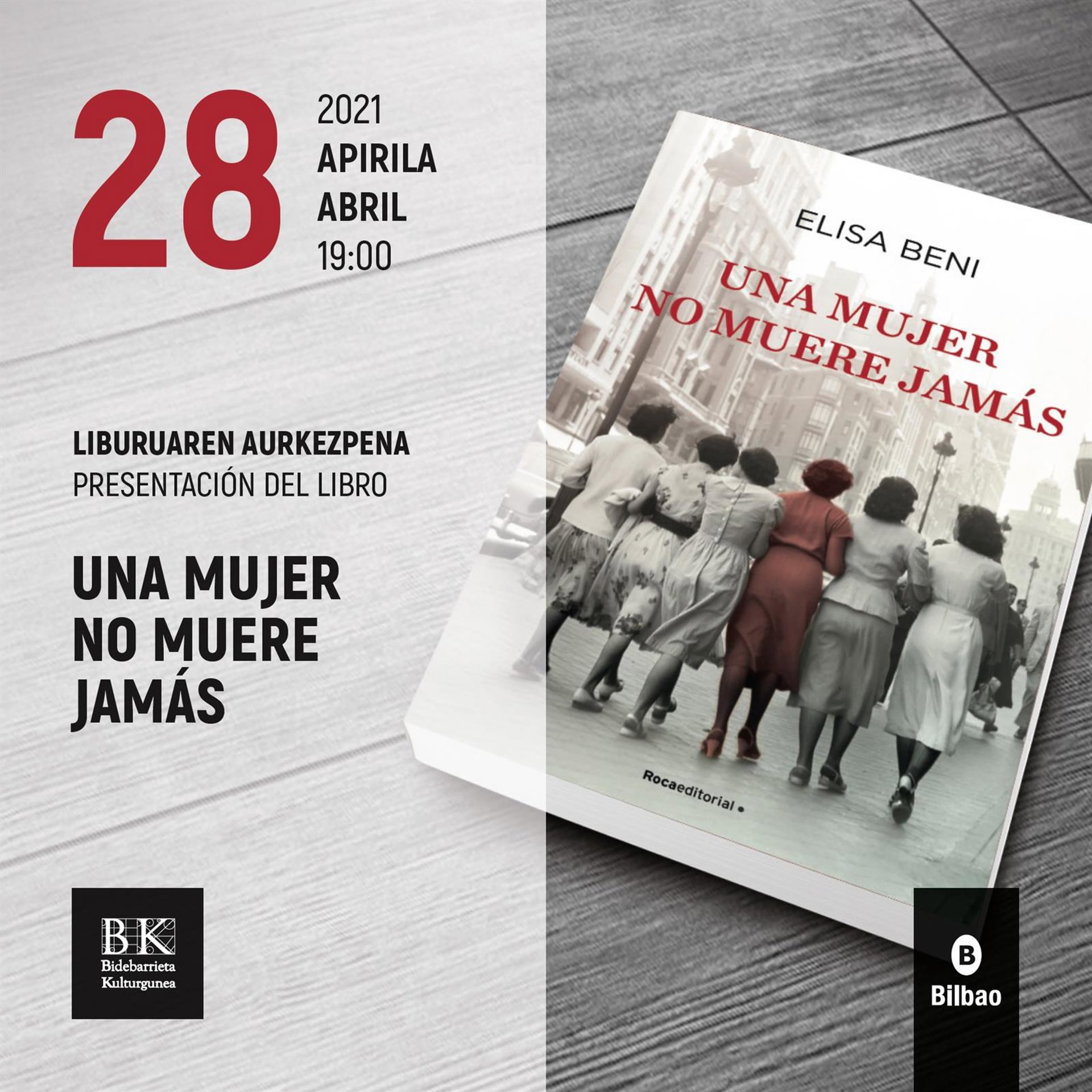 El espacio Bidebarrieta Kulturgunea del Ayuntamiento de Bilbao acogerá este miércoles la presentación del nuevo libro de la periodista Elisa Beni, "Una mujer no muere jamás". La presentación tendrá lugar en el Salón de Actos de la Biblioteca Bidebarrieta a las 19.00 horas y la autora dialogará con el también periodiodista César Coca.