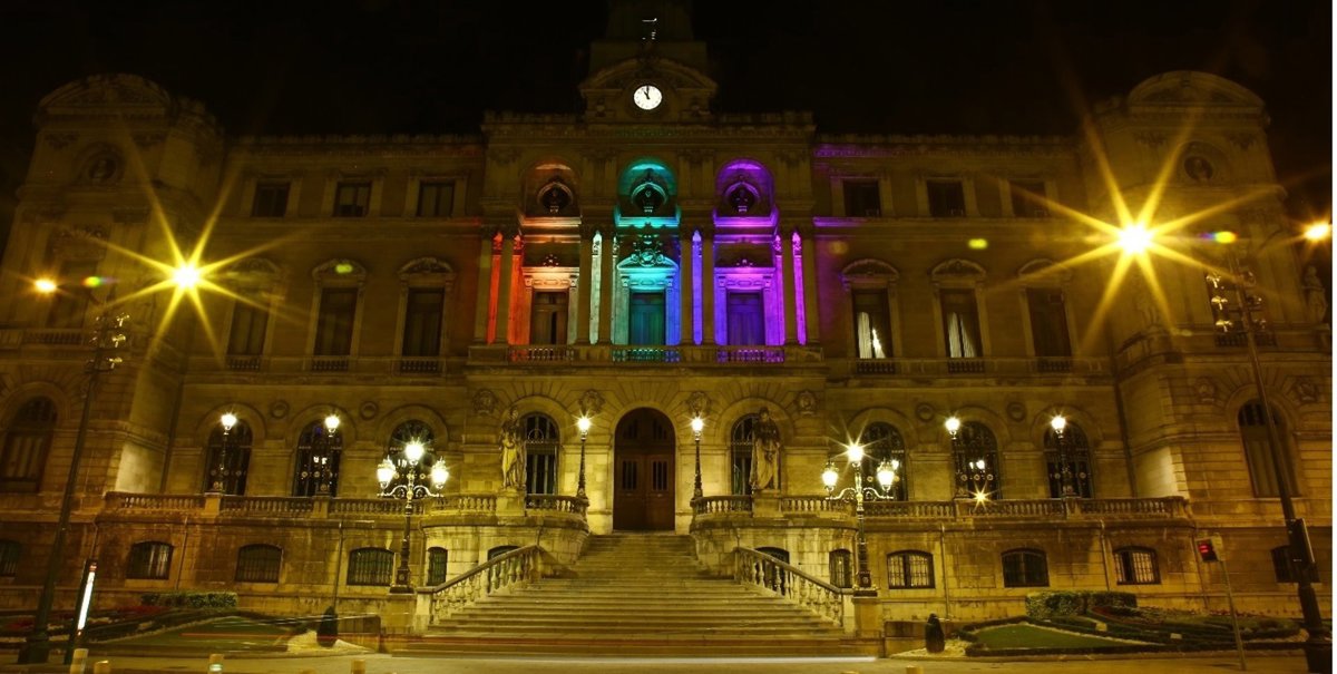 Fachada del Ayuntamiento de Bilbao iluminada con el arcoíris representativo del colectivo LGTBIQ+ - AYUNTAMIENTO DE BILBAO