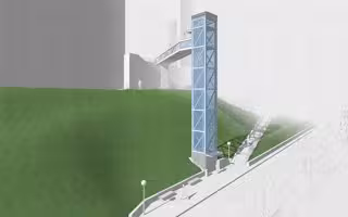 Se materializará mediante núcleo vertical, resuelto con estructura metálica con una de sus caras recubierta de vidrio laminado. Las otras tres caras se recubrirán de panel de fachada ventilada, con un acabado similar al del muro en el que se ubica para una mejor integración urbanística.