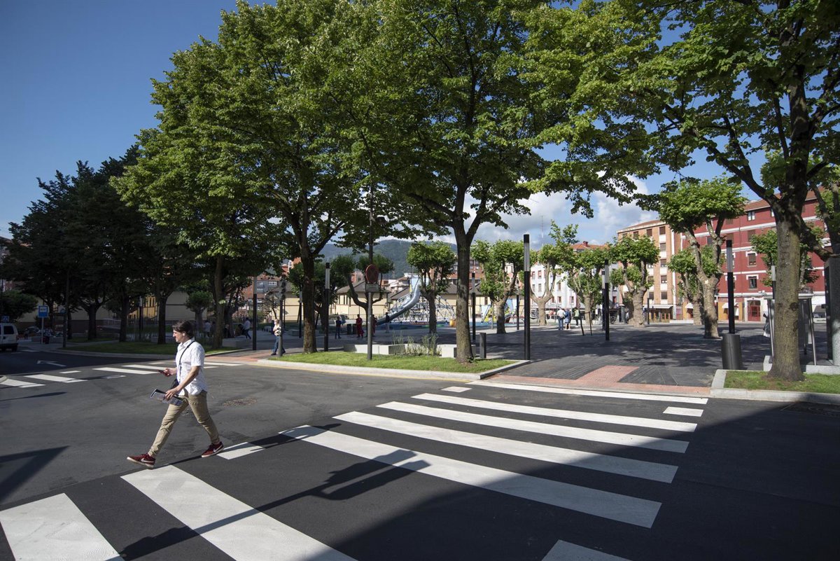 El paso de peatones ha sido desplazado a la calle Iturriaga y se han eliminado los alcorques y habilitado un parterre que hace de separación entre el vial y la acera. Junto a él, se han generado nuevas zonas estanciales que cuentan con el mismo pavimento drenante utilizado en la plaza.