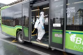Efectivos sanitarios desinfectan autobuses de Bizkabus durante el estado de alarma en Bilbao - H.Bilbao - Europa Press - Archivo