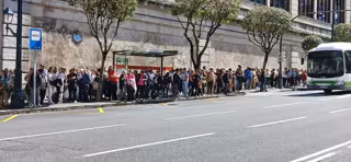 Bizkaibus ha reforzado su servicio ante la afección del apagón a la red ferroviaria para garantizar la movilidad de la ciudadanía. En las paradas de los autobuses de Bilbao se registran largas colas de usuarios.