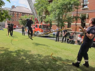 A continuación, han charlado y preguntado a los niños aspectos relacionados con su profesión para, a continuación, saltar a la comba con una y dos mangueras a la vez, mientras portaban alguna de sus herramientas de trabajo, como hachas, extintores o mazas de golpeo.