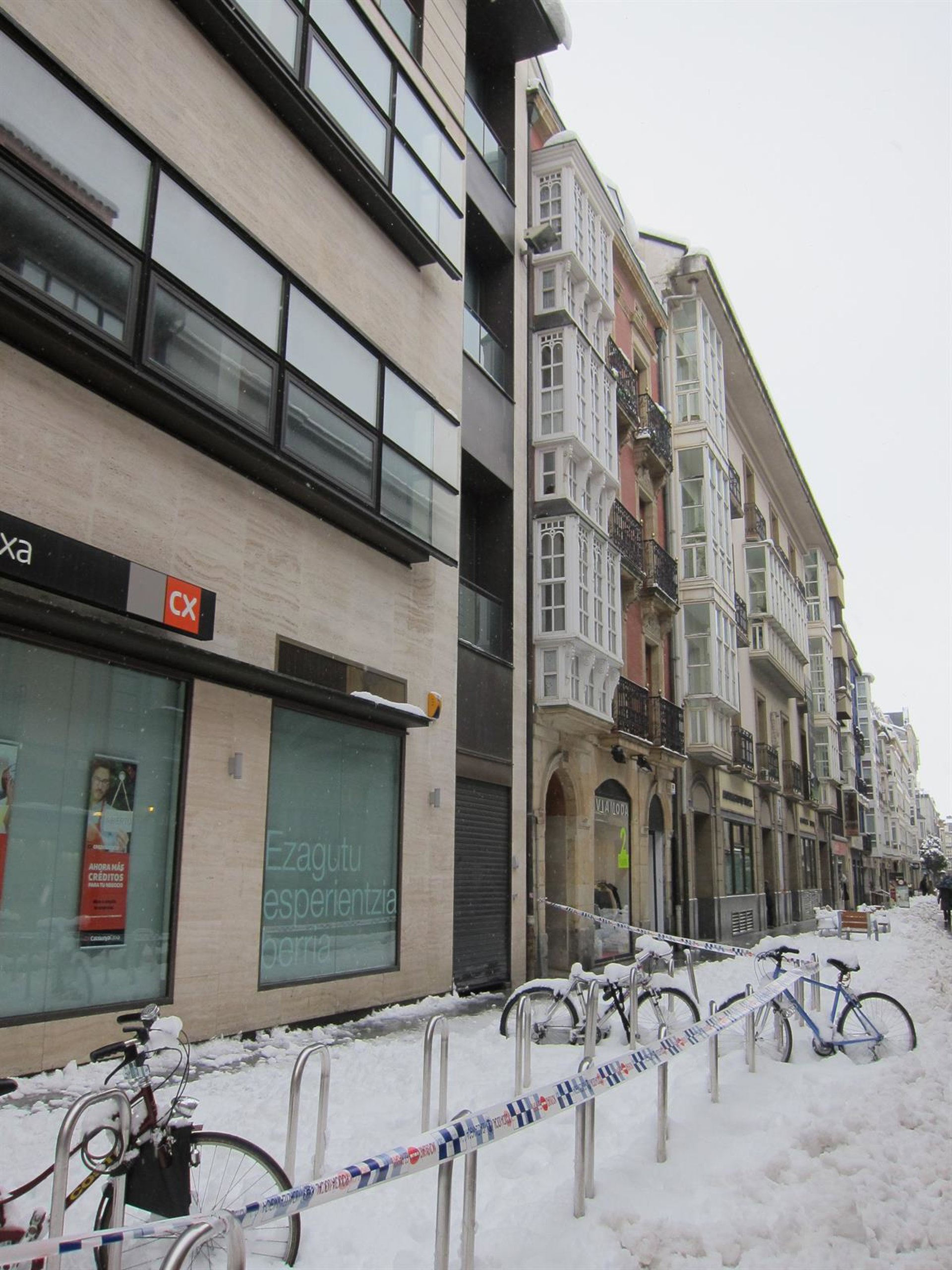 La caída de nieve desde un tejado en la calle Ramiro de Maeztu causó daños en la estructura de un toldo y algunas fachadas de edificios también sufrieron desprendimientos.