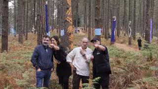 El Bosque de Oma se abre este lunes a las visitas de los conjuntos artísticos más conocidos del artista Agustín Ibarrola. Los visitantes podrán ver el proceso de pintado que realiza el equipo multidisciplinar encargado de trasladar la obra al nuevo enclave.