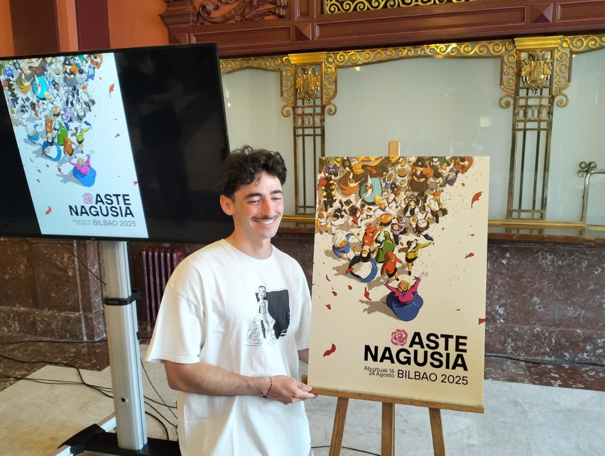 Mario Larrinaga Mochales, ganador del concurso de carteles anunciadores de Aste Nagusia, posando junto a su obra. - EUROPA PRESS