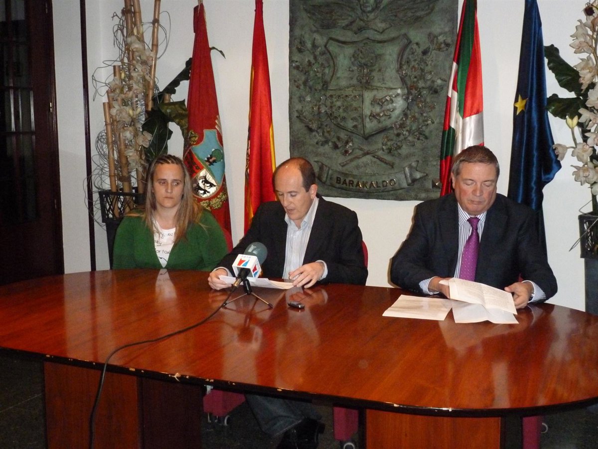 El concejal de Cultura de Barakaldo, Carlos Fernández, junto al portavoz y vocal de la recién creada Asociación Benéfica de Ayuda a Garikoitz (ABAG), Julián Celaya, y la madre del niño, Almudena Rodríguez, han presentado en rueda de prensa en el Ayuntamiento la iniciativa, organizada conjuntamente con el MotoClub Seginus y la Asociación de Vecinos de Urban-Galindo.