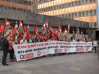Los sindicatos CC.OO. y UGT de Euskadi se han concentrado este miércoles en Bilbao para reivindicar el trabajo "decente" contra "la pobreza, la exclusión y la creciente desigualdad" y exigir que se refuerce la negociación colectiva, "no solo en nuestros países, sino en Europa, en las propias empresas transnacionales".