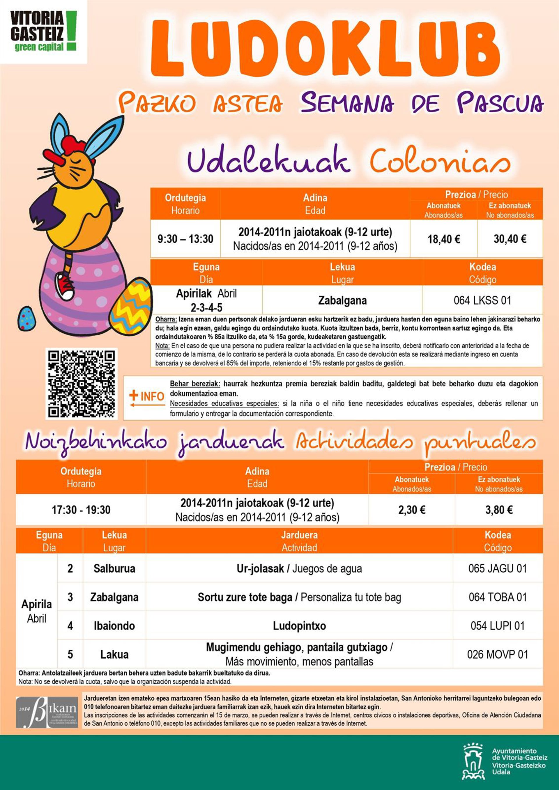 También se celebrarán actividades para la Semana de Pascua en los ludoclubes. Por la mañana habrá una colonia en el ludoclub del centro cívico de Zabalgana, programada para los nacidos entre 2011 y 2014. Las actividades consistirán en juegos cooperativos, manualidades y actos similares, en horario de 9.30 a 13.30 horas y con 25 plazas.