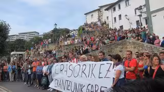 Tras una pancarta en la que se leía el texto "Erasorik ez erantzunik gabe" (Ni una agresión sin respuesta), los vecinos han secundado a las cuatro y media de la tarde en las escaleras del Puerto Viejo una concentración silenciosa de diez minutos, convocada por el Ayuntamiento de Getxo, junto con la Comisión de Fiestas del Puerto Viejo.