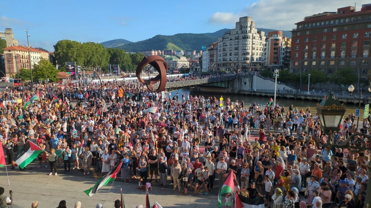 La marcha ha partido a las siete de la tarde desde la Plaza Moyúa, tras una pancarta con el texto 'Stop genocidio. Europa laguntzaile (Europa cómplice)", en la que se han ondeado numerosas banderas palestinas y se han coreado lemas como "Boicot Israel", "Palestina askatu (Libertad para Palestina)" o "No es una guerra, es un genocidio".