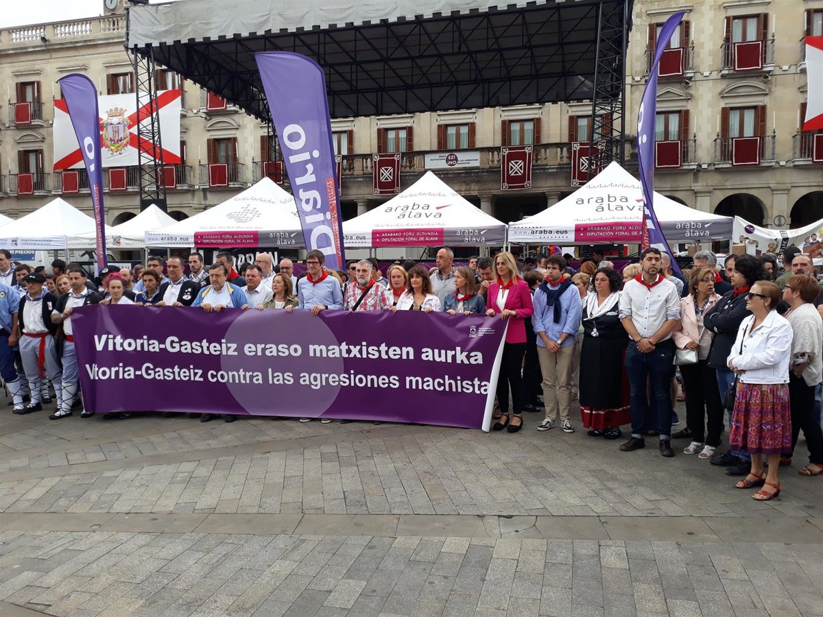 Representantes institucionales, miembros de las cuadrillas de 'blusas' y 'neskas', y ciudadanos particulares se han concentrado este jueves en Vitoria en contra de las agresiones machistas, en un acto en el que el alcalde, Gorka Urtaran, ha llamado a rechazar con "contundencia" esta forma de violencia.