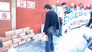 Varias personas con buzo de trabajo han levantado un muro, bajo la supervisión de la Ertzaintza para no entorpecer la entrada a las oficinas, a la entrada del Lanbide de Sestao, "municipio con la tasa de desempleo más alta de Euskal Herria, un 24% de la población activa", según han denunciado los convocantes de la movilización. Junto a ellas, se han concentrado otro grupo de personas con una pancarta con el lema "Ezkerraldea va a más. Más paro, más pobreza, más precariedad".