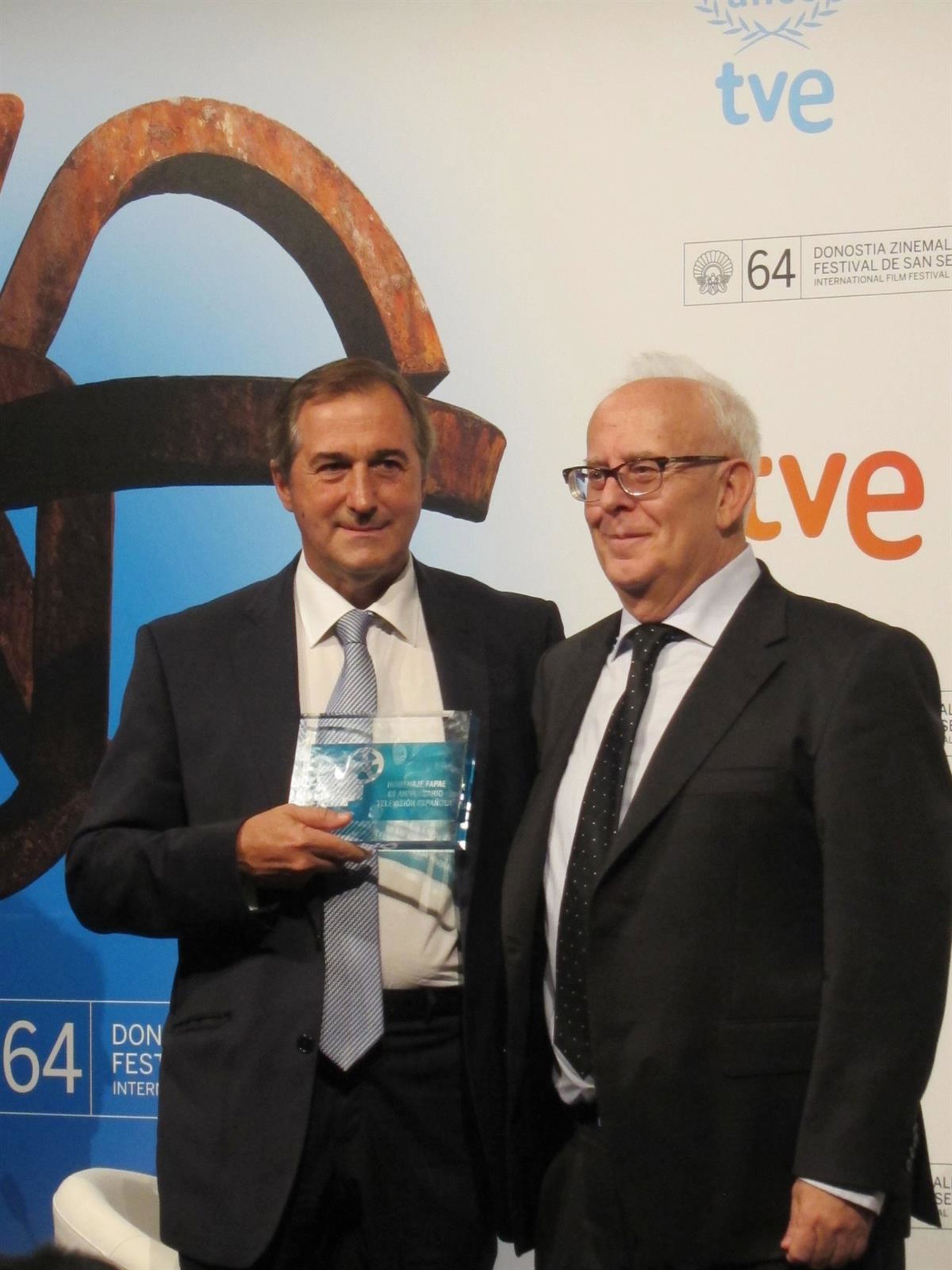 El presidente de la Confederación de productores audiovisuales españoles FAPAE, Ramón Colom, ha premiado a TVE este miércoles, en el marco del 64 Festival Internacional de Cine de San Sebastián, con motivo de su 60 aniversario, y ha destacado que "sin televisión pública no exisitiría el cine español tal y como lo conocemos".