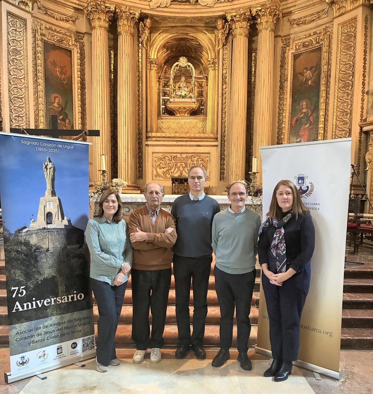 La vocal de la Junta directiva de la Asociación de Amigos del Sagrado Corazón de Urgull, Ana Zulaica, y su presidente, Javier Ganuza, el párroco de Santa María del Coro, Edorta Kortadi, el vicepresidente del Orfeón Donostiarra, José Luis Aramburu, y la secretaria del Orfeón Donostiarra, Sonia Esturo, han dado cuenta de la conmemoraicón de los 75 años del citado monumento, construido en 1950.