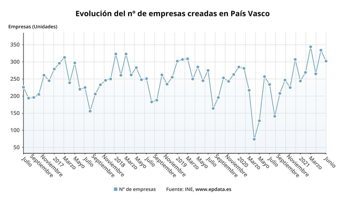 El número de nuevas sociedades mercantiles en Euskadi creció un 17,51% en junio de 2021 respecto al mismo mes del año anterior, hasta sumar 302 empresas, la comunidad autónoma con la menor tasa de crecimiento del conjunto del Estado. En cuanto a las disoluciones empresariales, aumentaron un 8,2%, hasta totalizar 79, según los datos difundidos por el Instituto Nacional de Estadística (INE).