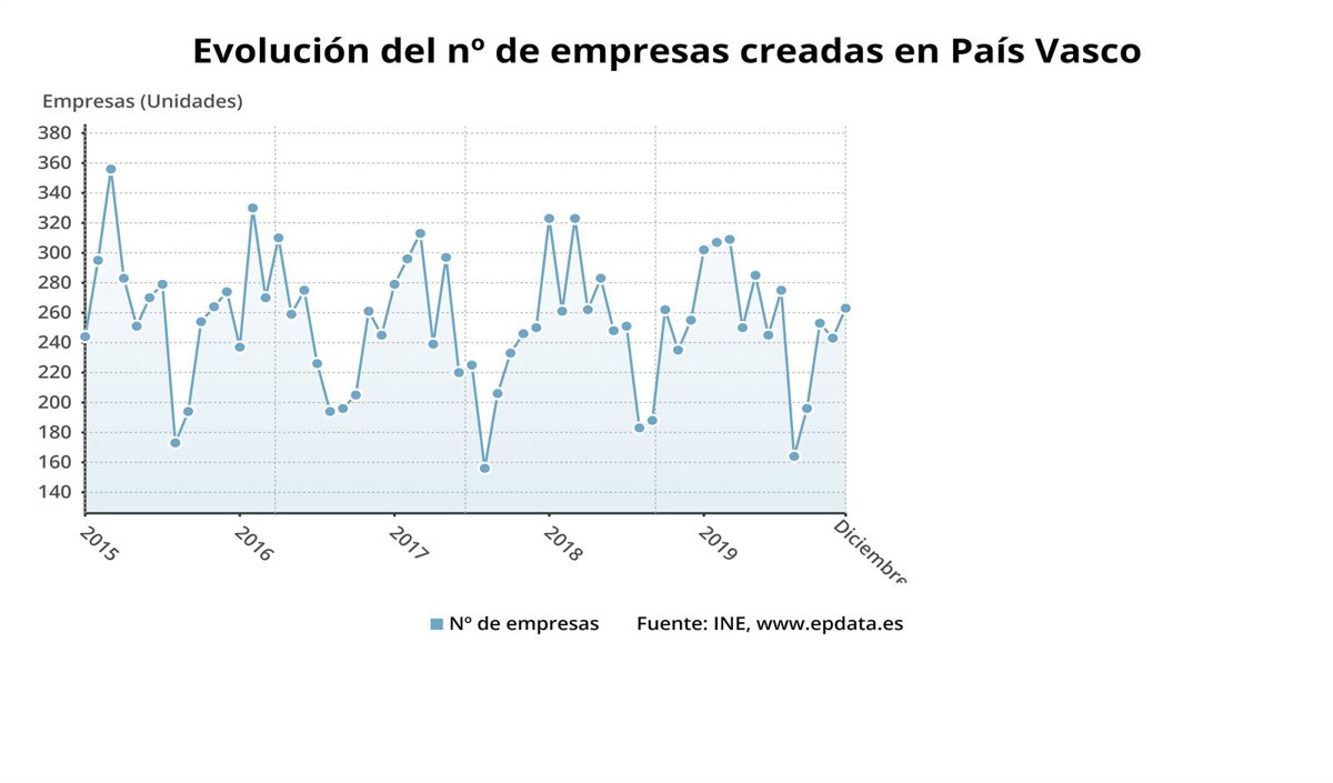 Por lo que respecta al mes de diciembre, Euskadi registró 263 nuevas sociedades mercantiles, la tercera mayor cifra del Estado por detrás de Madrid y Andalucía. Este dato supone un aumento del 2,7% en comparación con el último mes de 2018, por debajo de la media estatal del 4,2%.