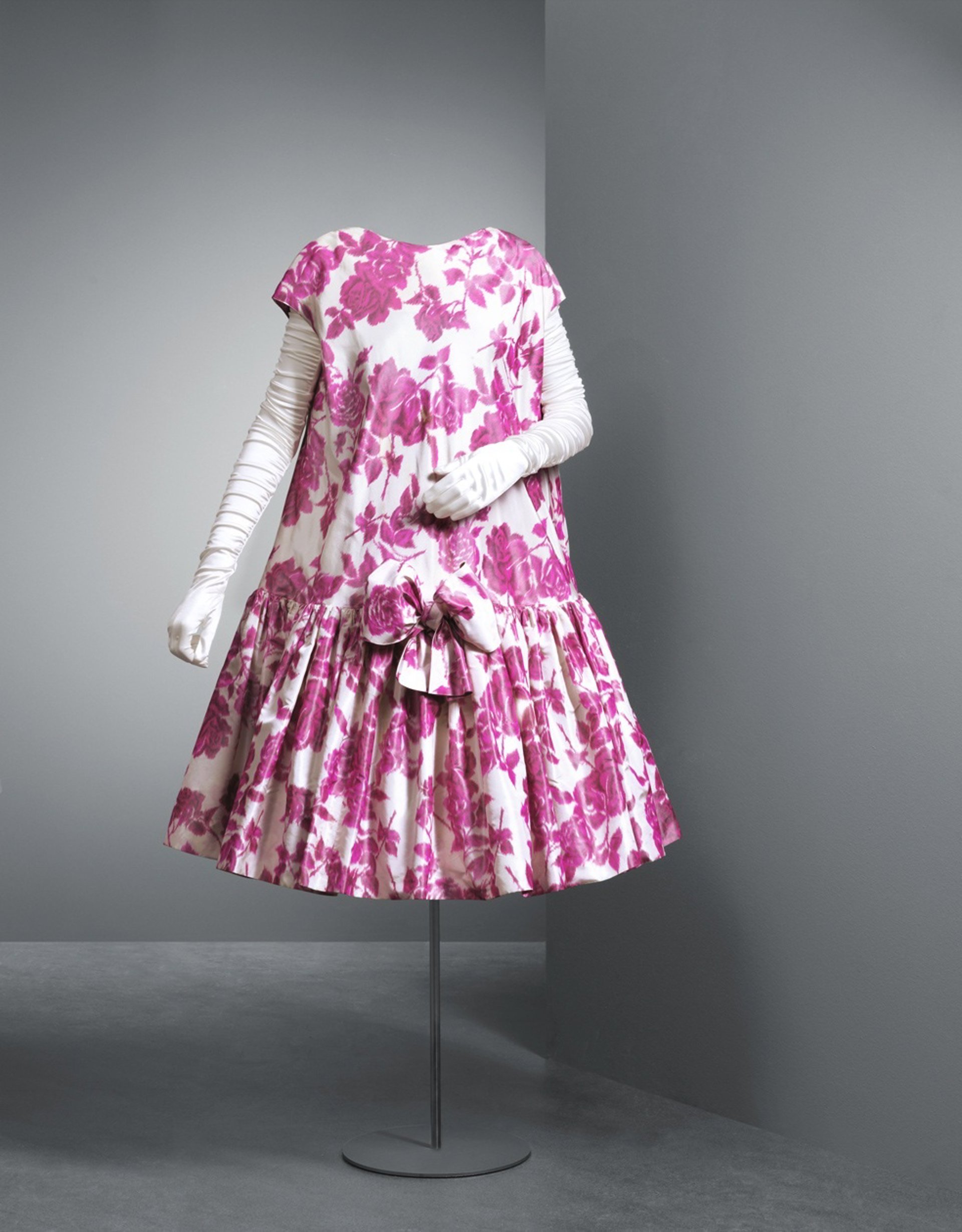 Para esta ocasión, la responsable de Colecciones y Curator de Cristóbal Balenciaga Museoa, Miren Arzalluz, ha seleccionado el vestido Vestido baby doll, creado en 1958, en tafetán de seda color marfil con estampación floral en varios tonos de rojo y fucsia.