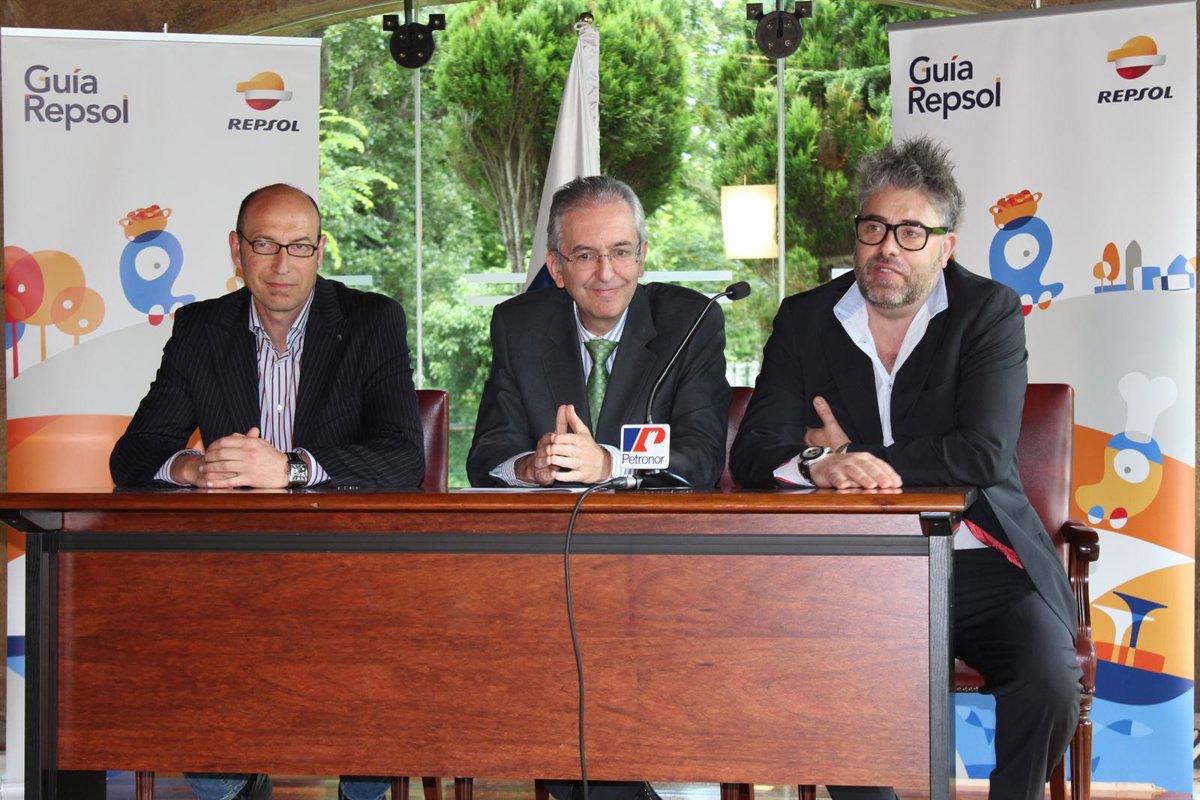 El director general de Petronor, Víctor Pérez de Guezuraga, el gerente de Enkartur, Koldo Santiago, y el alcalde de Karrantza, Raúl Palacio Portillo, han presentado este martes la Cueva de Pozalagua como representante de Euskadi en el concurso "El Mejor Rincón 2013" de Guía Repsol.