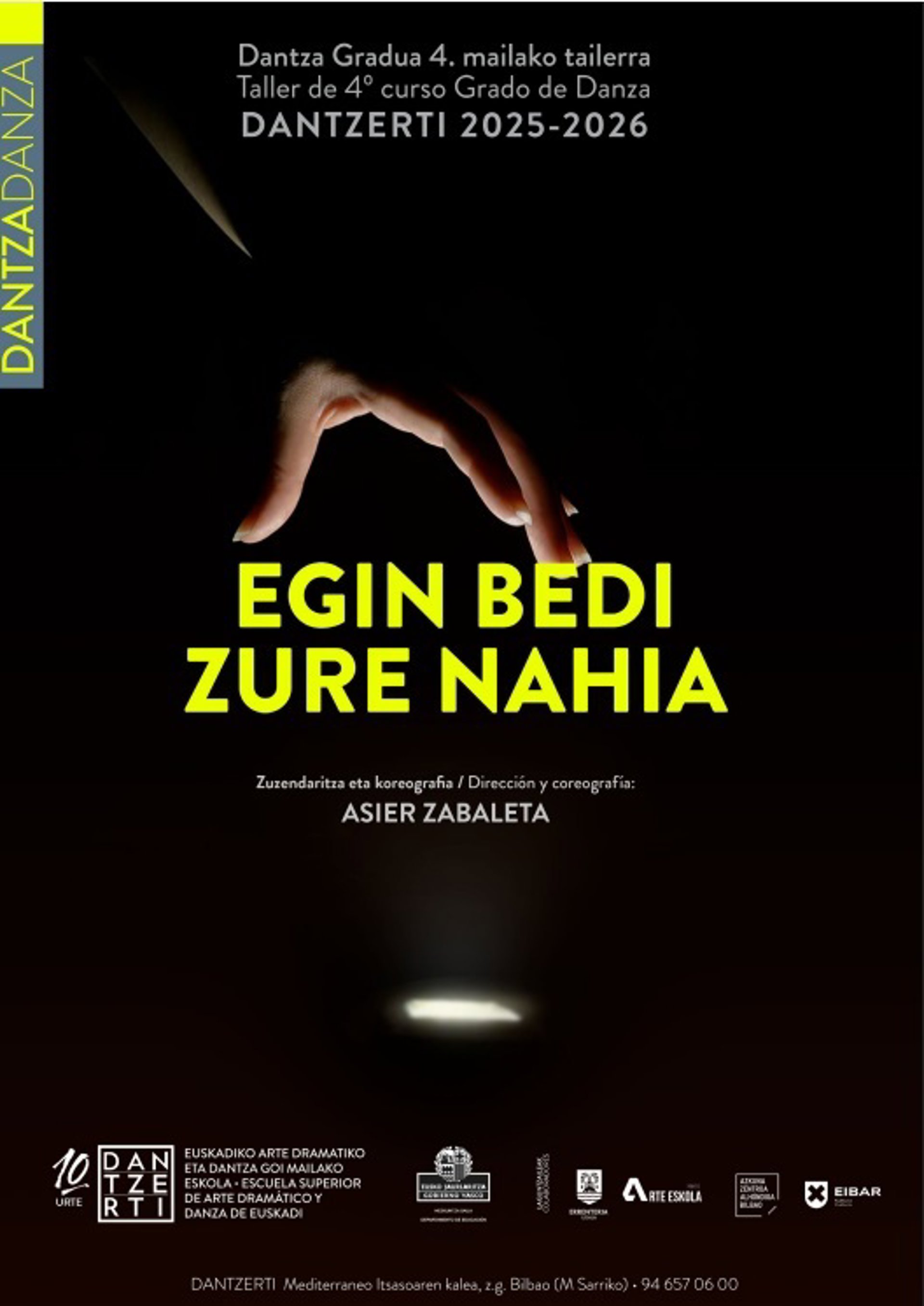 La Escuela Superior de Arte Dramático y Danza de Euskadi, Dantzerti, presenta en Errenteria, Bilbao y Eibar su montaje fin de grado dirigido por el coreógrafo goierritarra Asier Zabaleta 'Egin bedi zure nah-ia'.