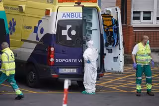Varios sanitarios protegidos, uno con un traje y otro con mascarilla y guantes de látex, junto a una ambulancia en el Hospital Universitario Cruces - H.Bilbao - Europa Press