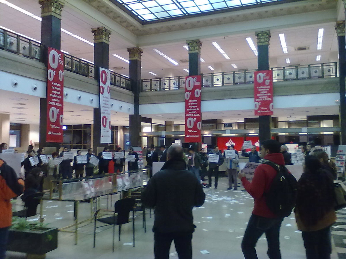 A las doce menos diez de la mañana, han abandonado la sede del Banco Santander y se han concentrado en el exterior, donde han desplegado una pancarta en la que se podía leer" "Banca y gobierno nos roban las pensiones".