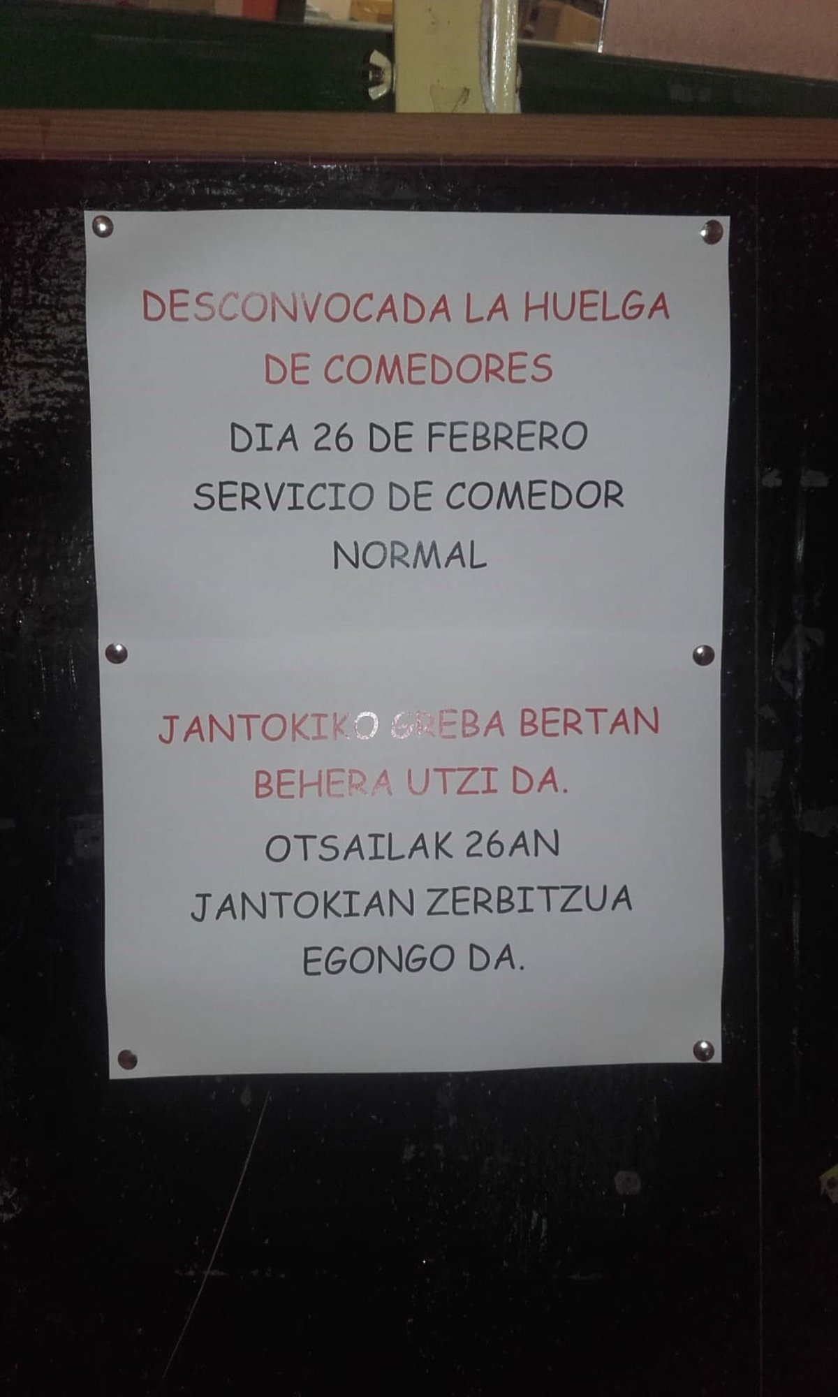 La huelga prevista para este martes en los comedores escolares de gestión directa de Álava, Bizkaia y Gipuzkoa ha quedado desconvocada por los sindicatos LAB, UGT y CCOO tras el preacuerdo firmado con las patronales el pasado jueves en primera instancia y ratificado el viernes por la tarde por las asambleas de trabajadoras de los tres territorios.