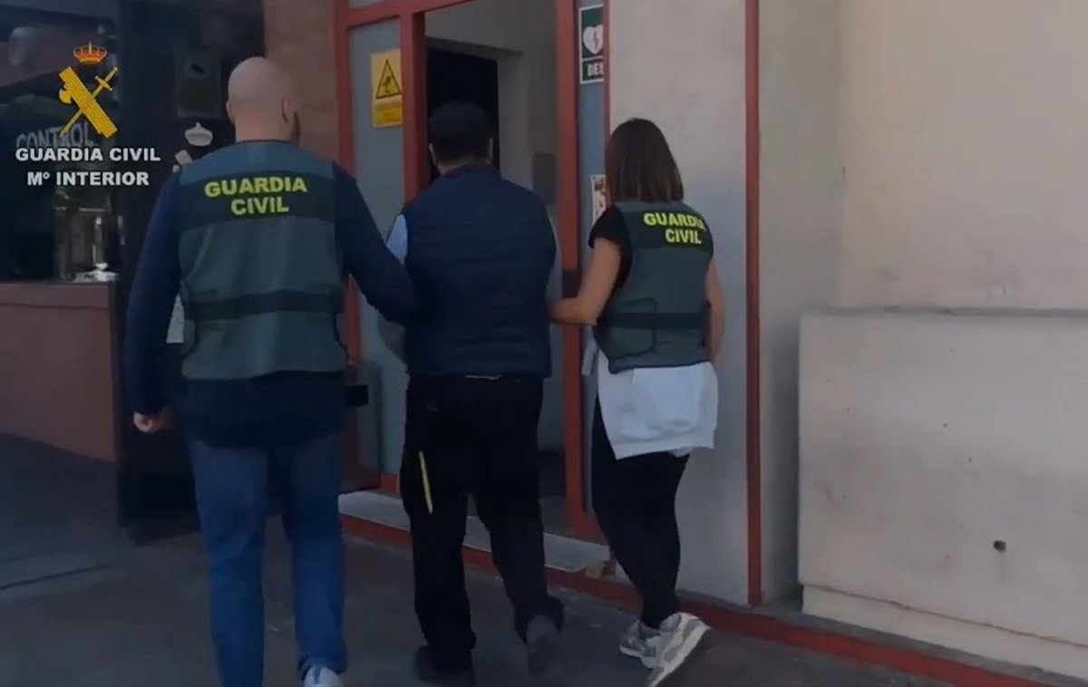 Agentes de la Guardia Civil con uno de los detenidos durante el registro. - GUARDIA CIVIL
