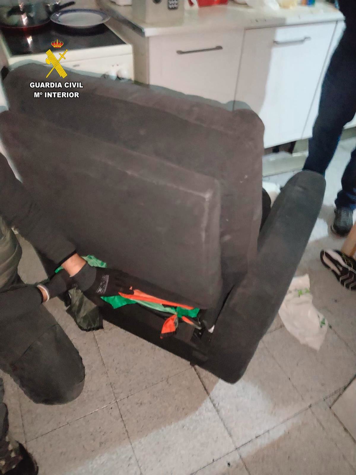 En una chaqueta colgada en un perchero próximo al sofá, hallaron una placa envuelta en film transparente de sustancia resinosa, junto a una navaja con restos adheridos de la misma sustancia. Además, sobre la encimera de la cocina, se localizó una bolsa de plástico con polvo de color marrón claro, con un peso aproximado de 24 gramos.