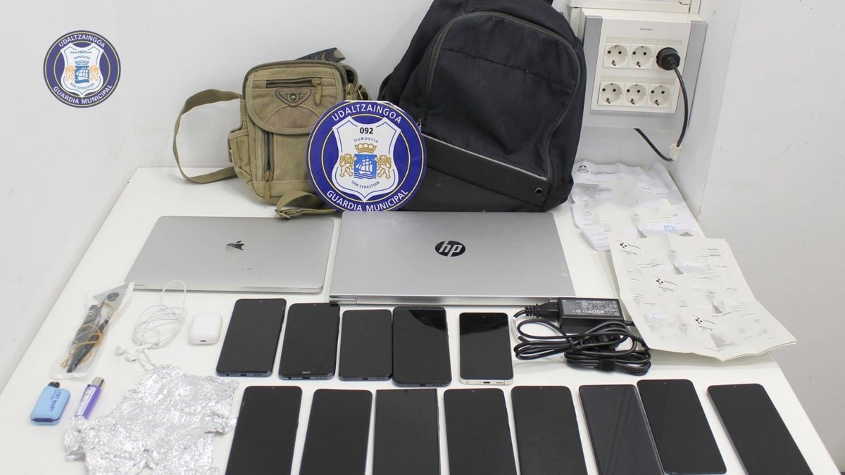 Agentes de la Guardia Municipal coordinados con la persona denunciante siguieron la pista de la señal del ordenador hasta las inmediaciones de la plaza Easo, donde interceptaron a un varón de 43 años que portaba una mochila con dos ordenadores portátiles y 13 teléfonos en su interior.