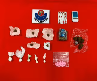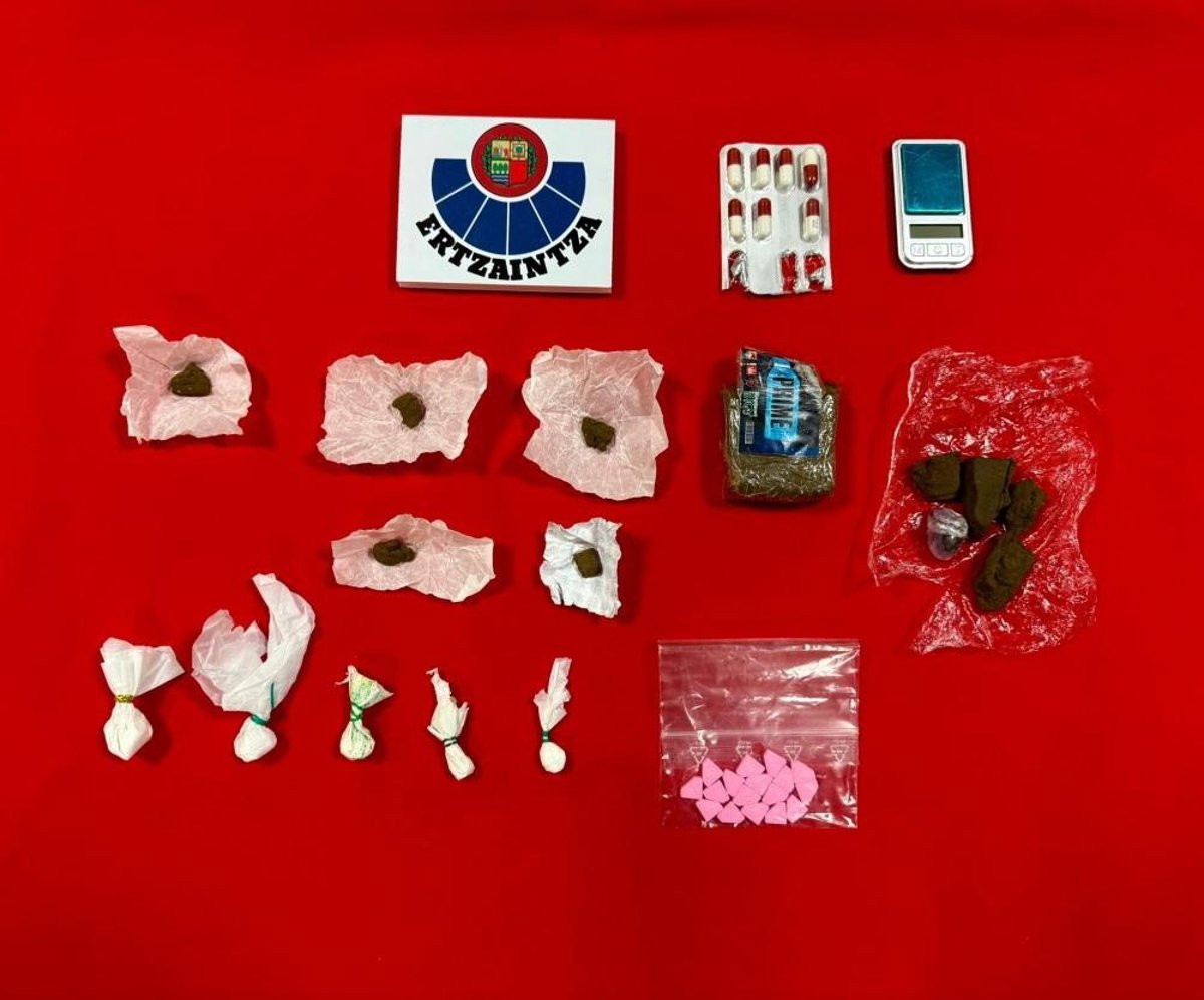 La Ertzaintza ha detenido en Vitoria este sábado a dos hombres de 25 y 28 años de edad acusados de sendos delitos contra la salud pública tras serles incautadas diversas sustancias estupefacientes, entre las que se hallaron varios gramos de hachís, pastillas, tabletas y bolsitas con sustancias en polvo.