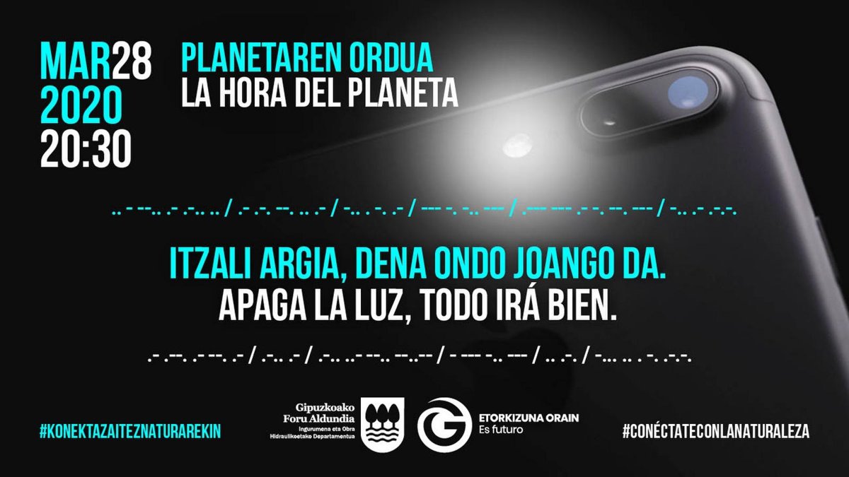 La Diputación de Gipuzkoa ha llamado a la ciudadanía a sumarse este sábado a la iniciativa 'La Hora del Planeta' que, cada 28 de marzo y durante una hora, convoca la organización en defensa de la naturaleza WWF. En ese sentido, ha pedido que los guipuzcoanos, a las 8 y media de la tarde, apaguen la luz, salgan al balcón y envíen "un mensaje de esperanza" con sus linternas.