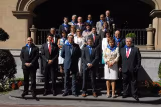 El presidente del Athletic Club, Josu Urrutia, ha recibido al diputado general y a los representantes del Gobierno foral en las escalinatas del Palacio, donde han posado durante unos minutos para los medios de comunicación. A continuación, ambas delegaciones han accedido al interior de la sede rojiblanca.