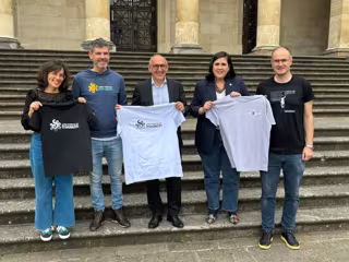 Por parte de los organizadores, el responsable de la fiesta de las ikastolas en Álava, Joseba Aginagalde, el presidente de la asociación Araba Euskaraz, Unai Mendizabal, y Arturo Lopez de La Calle, director de San Bizente Ikastola, quienes han entregado al máximo responsable foral, la camiseta de esta edición.