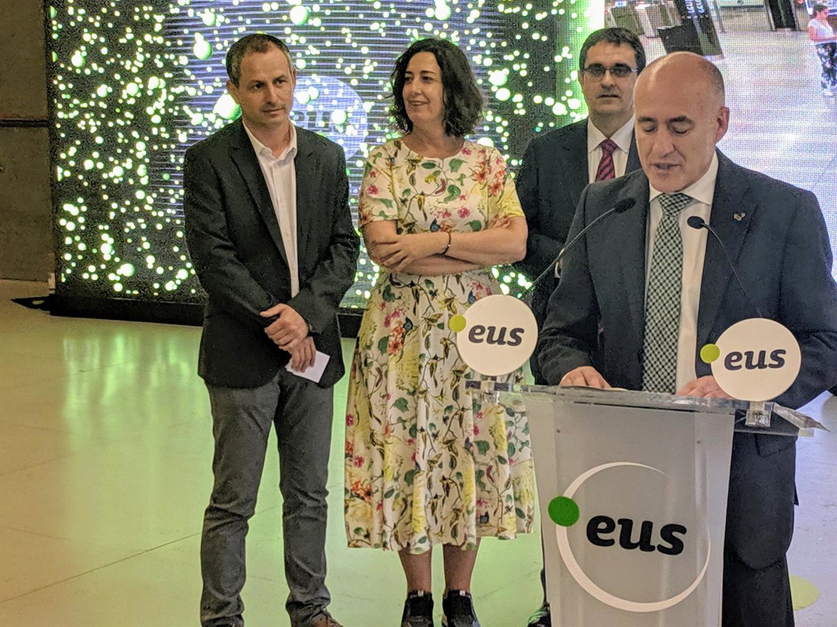 Con motivo de los primeros cinco años de vida de estos dominios, el presidente de la Fundación PuntuEUS, Iñaki Goirizelaia, y su director, Josu Waliño, junto a la diputada vizcaína de Cultura, Lorea Bilbao, y el gerente de Metro Bilbao, Eneko Arruebarrena, han ofrecido una rueda de prensa en la estación intermodal de San Mamés en la capital vizcaína.