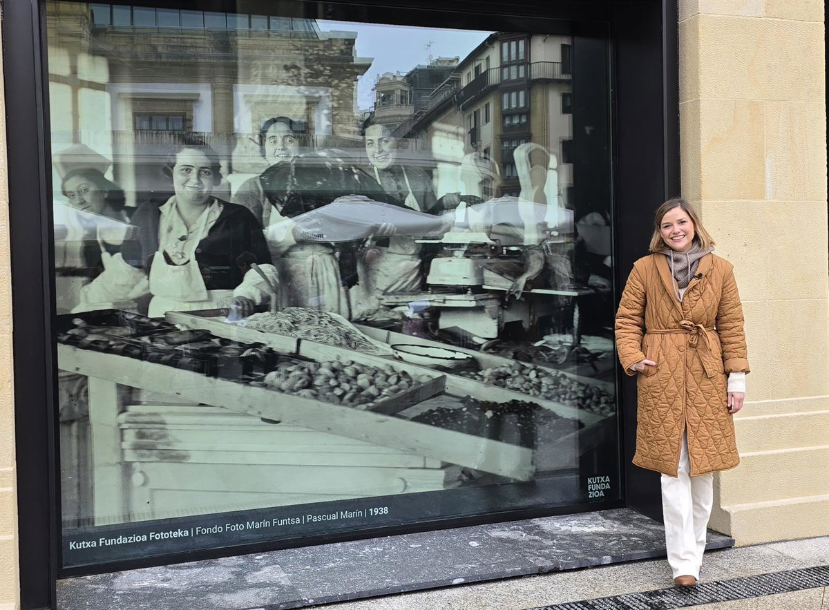 Oyarbide ha presentado las fotografías de gran tamaño que visten desde este martes los arcos de la fachada de Arkoak, "un guiño especial a la historia del mercado con una muestra de imágenes históricas cedidas por Kutxa Fundazioa Fototeka".