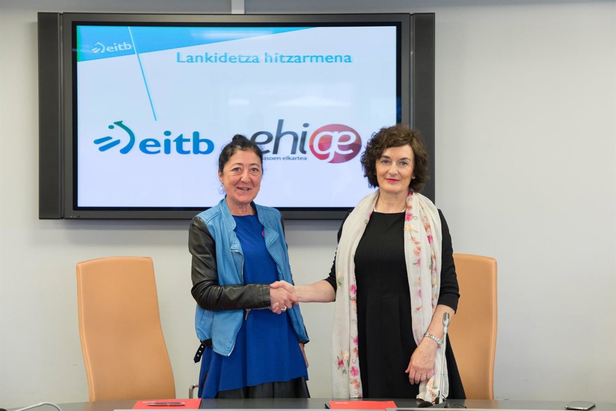La presidenta de EHIGE-Confederación de Padres y Madres de la Escuela Pública Vasca, Ana Isabel Puente, y la directora general de EiTB, Maite Iturbe, han renovado el acuerdo de colaboración a través del cual EiTB será un año más patrocinadora de la fiesta de la Escuela Pública Vasca, ofrecerá el spot promocional anunciando la fiesta e informará puntualmente de la jornada en sus diferentes medios.