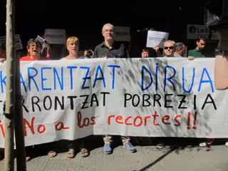 Ambos sindicatos, junto con diversos agentes sociales, se han concentrado este martes ante la sede de Lanbide en Bilbao ante una pancarta en la que podía leerse "Bankarentzak dirua, herrirointzak pobrezia. ¡No a los recortes!".