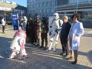 Un año más, la entrada del robot rosa ha sido recibida con "muestras de alegría y curiosidad" por las niñas y los niños, que junto a sus compañeros de Star Wars, han repartido regalos para todos. KaTy ha sido creada por una asociación donostiarra de fans de la saga de George Lucas Legión 501. La visita al hospital se enmarca dentro de la campaña #ThePinkForce que fomenta "un mundo con más niñas y niños felices y menos cáncer".