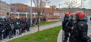 Desde primera hora de la mañana de este viernes, un fuerte dispositivo policial se ha situado ante la entrada del local. Alrededor de 15 furgonetas de la Brigada Móvil de la Ertzaintza, se han apostado en las cercanías y otras más en las calles adyacentes.