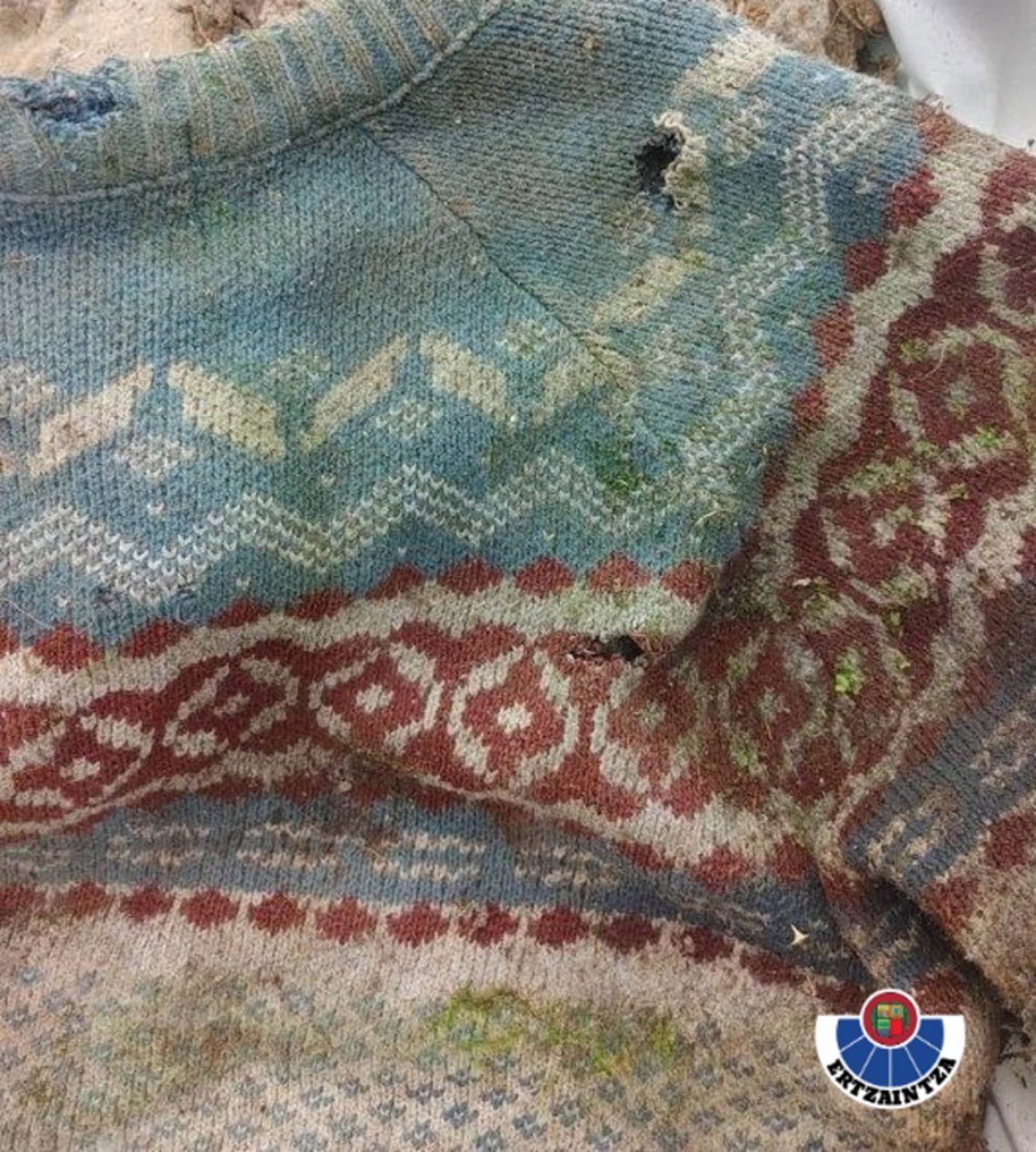 El estado de los mismos parece indicar que por lo menos podría llevar en el lugar más de diez años y junto al cadáver se halló una camiseta blanca, un jersey de lana grueso con jaspeados azules y granates, un forro polar azul marino de Osakidetza, un chaquetón de piel marca Ami, talla M, y unas botas de la marca Dr Martens de color verde.