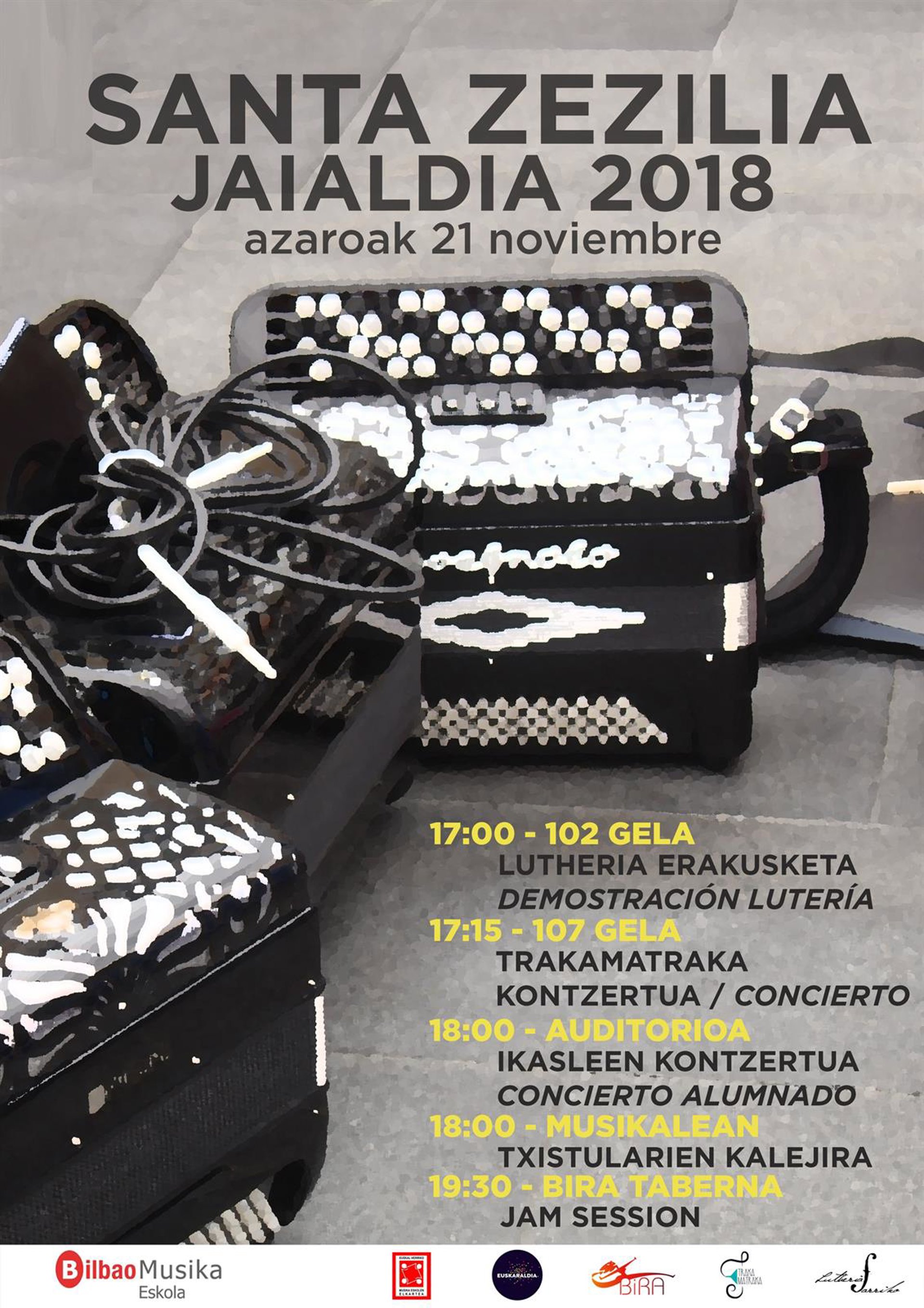 A continuación, a partir de las 18.00 horas, tendrá lugar una audición-concierto, de la mano del alumnado de la Escuela, en el auditorio de Bilbao Musika y, a la misma hora, las agrupaciones de txistularis amenizarán las Siete Calles y su entorno con un pasacalles, mientras que a las siete y media de la tarde, la Taberna Bira albergará una Jam Session.