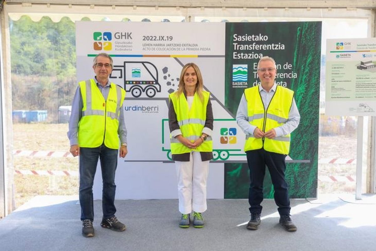 El presidente de GHK y diputado de Medio Ambiente, José Ignacio Asensio, junto a la presidenta de la mancomunidad de Sasieta, Leire Artola, y al director de GHK, Cesar Gimeno, han puesto este lunes la primera piedra de la Estación de Transferencia de Sasieta.