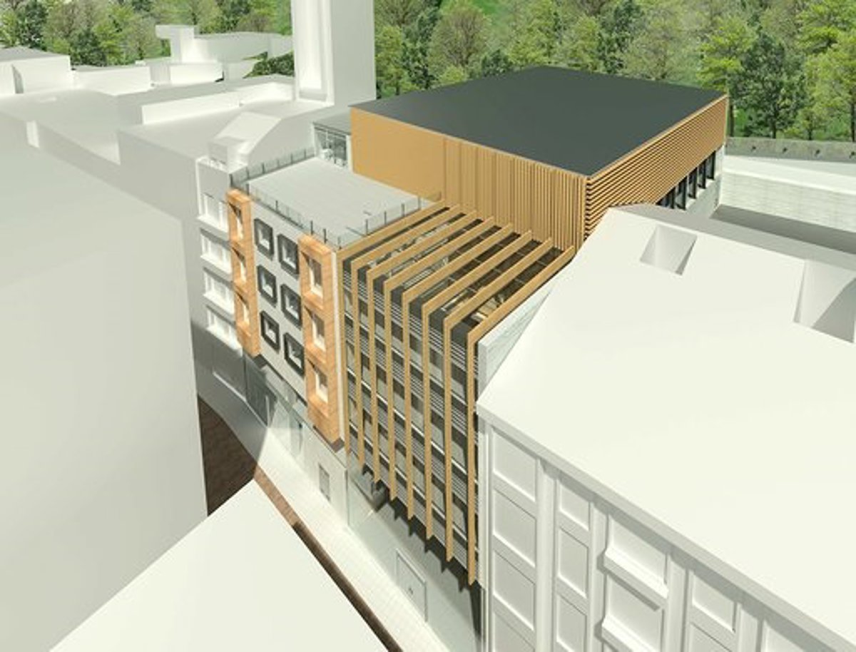 La parcela remanente tras la demolición del antiguo frontón será completamente edificada. La nueva edificación de titularidad municipal planteada tiene un objetivo doble: Por un lado, servir de soporte al nuevo frontón en altura y, por otro, aprovechar el nuevo espacio disponible y de oportunidad en medio de una zona urbana muy densa.