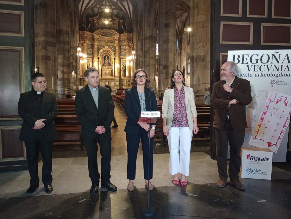 La Diputada General de Bizkaia, Elixabete Etxanobe, el obispo de Bilbao, Joseba Segura, han dado a conocer este jueves el proyecto de excavación arqueológica bajo la basílica de Begoña que busca hallar los restos del que pudiera ser el primer asentamiento poblacional humano y cuna del actual Bilbao.