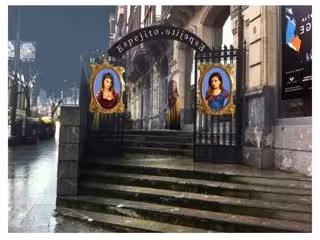 'Espejito espejito' es una pintura tipo mural desplegada en cinco escenas sobre "un visión muy particular" del cuento 'Blancanieves y los siete enanitos', que conforman una obra "singular y efímera" de 20 metros cuadrados instalada en el vallado del Parlamento de Bizkaia, han explicado sus responsables.