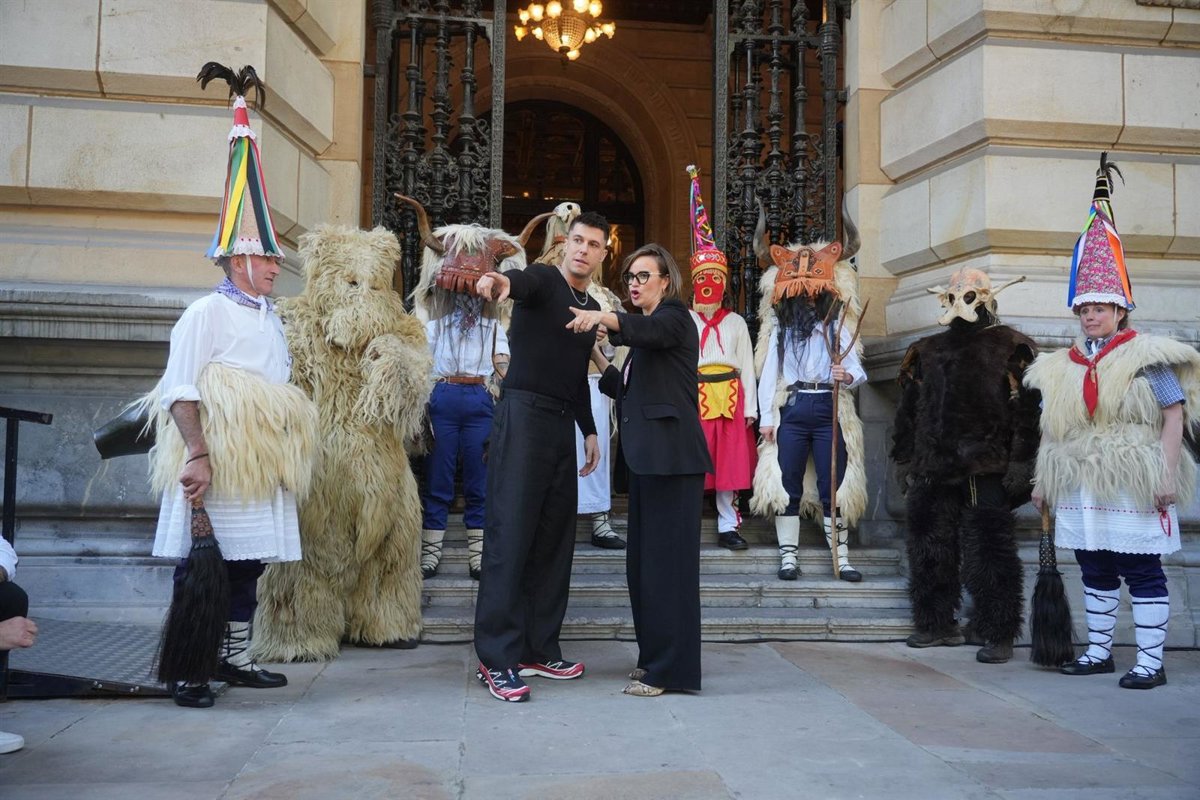 Cientos de fans de Zetak se han congregado este jueves por la mañana en la Gran Vía bilbaína, a las puertas del Palacio foral de Bizkaia, para ver a la banda liderada por el navarro Pello Reparaz, que ha estado acompañada de personajes de la mitología vasca y los 'joaldunak', que portan cencerros, típicos del tradicional carnaval de Ituren y Zubieta (Navarra).