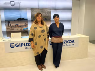 La diputada foral de Cultura de Gipuzkoa, Goizane Álvarez, y la arqueóloga foral Mertxe Urteaga, en una rueda de prensa sobre el fragmento del barco hallado en septiembre en la playa de Ondarreta - DIPUTACIÓN FORAL DE GIPUZKOA