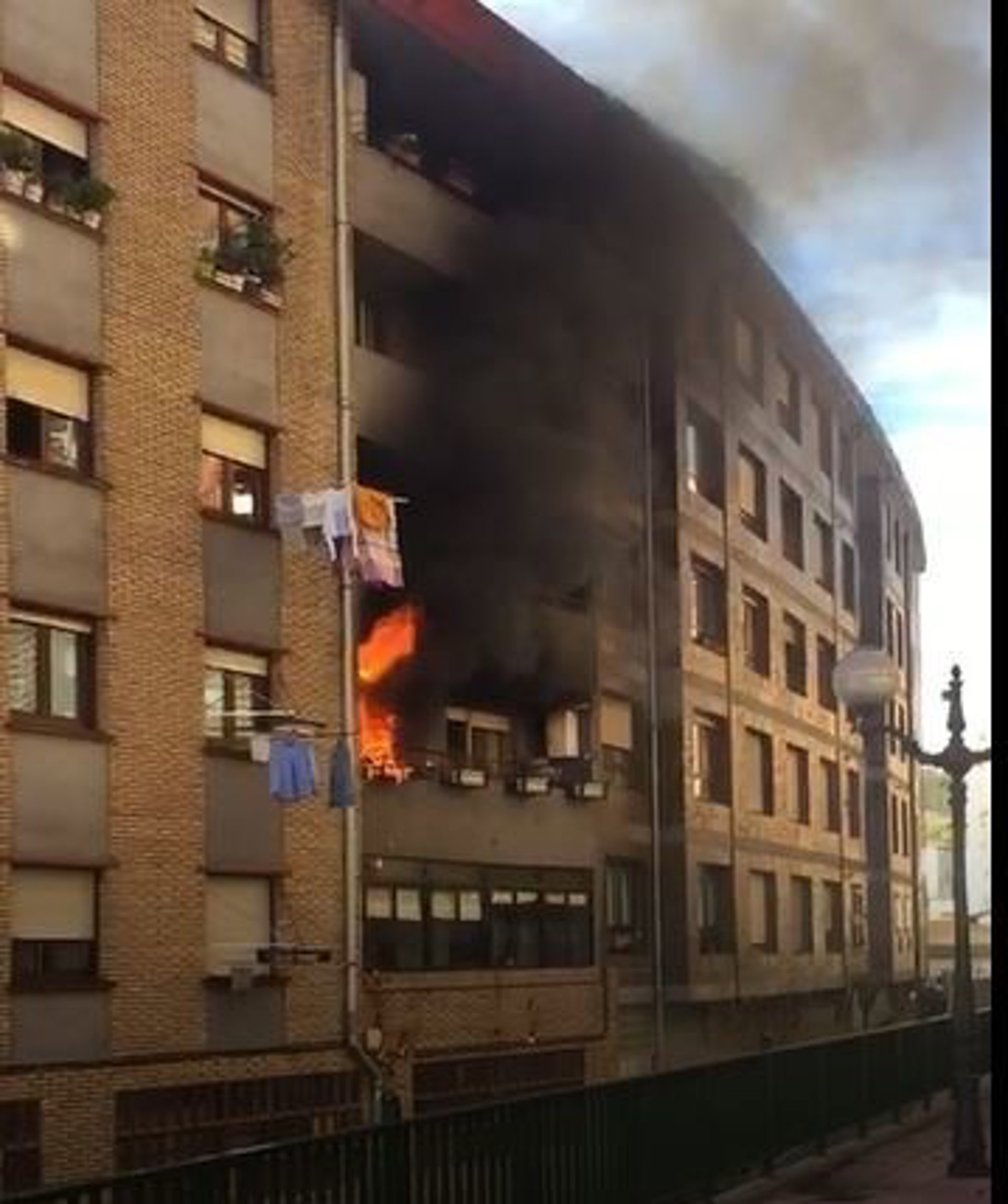 Pasadas las doce y media de esta mañana, los vecinos de esta zona han escuchado una explosión, y, momentos después, han visto salir llamas y gran cantidad de humo del balcón de un segundo piso en una vivienda de cinco alturas cercana a la estación de Metro de Matiko, en la calle muros de San Pedro.